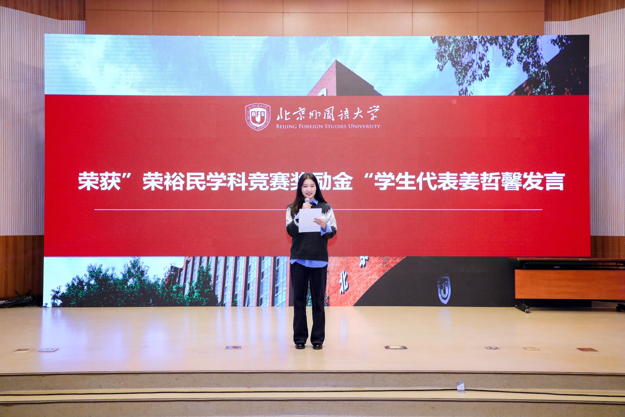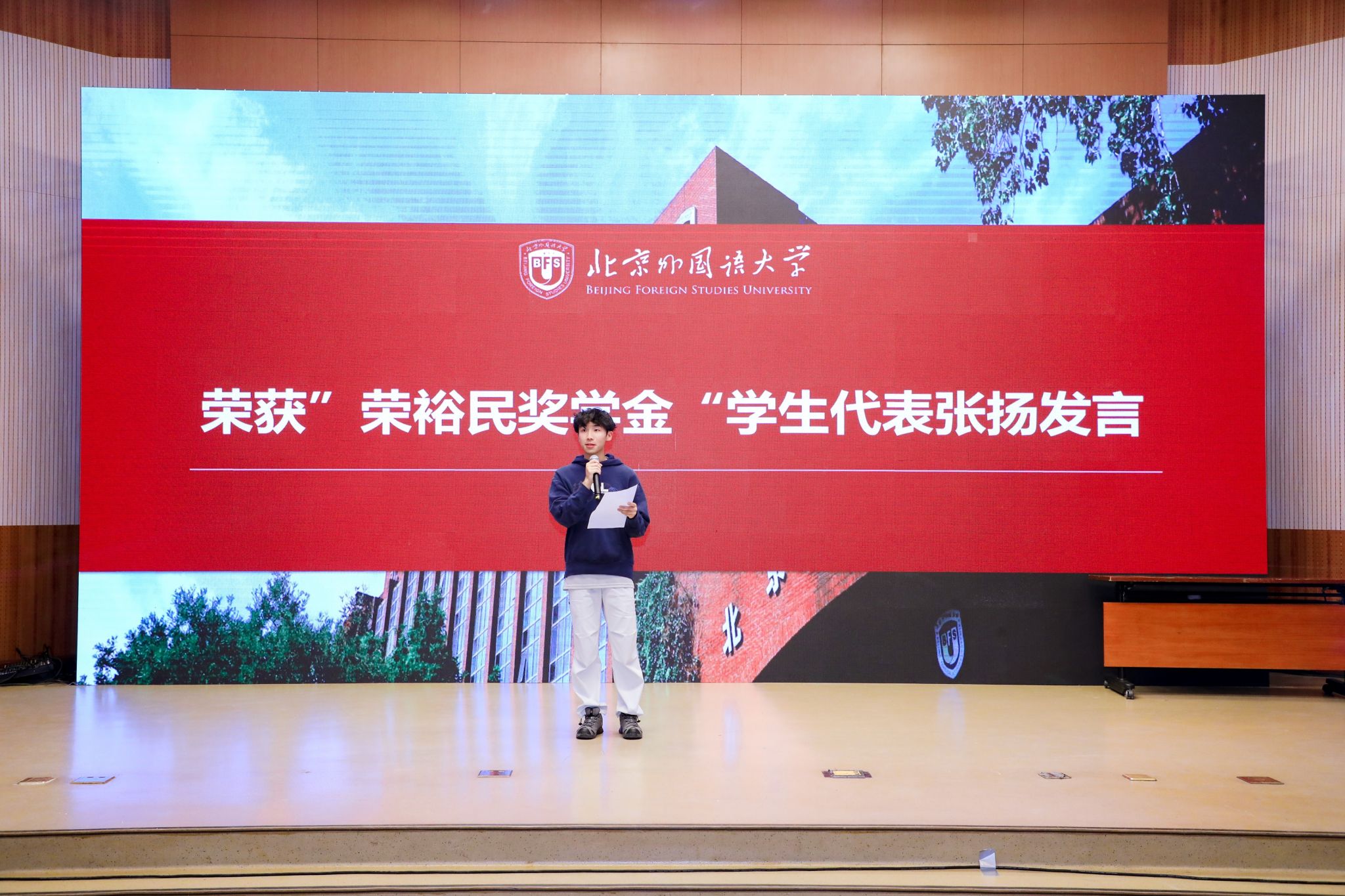 2023级本科生姜哲馨同学和2024级本科生张扬同学作为获奖学生代表发言,分享了在德语学习道路上的奋斗历程,衷心感谢荣裕民校友的慷慨捐助以及学校、学院的悉心培养。他们表示,这份荣誉既是认可更是责任,未来将继续以前辈为榜样,深耕专业知识,提升综合能力,以实际行动诠释北外德语人的使命与担当。