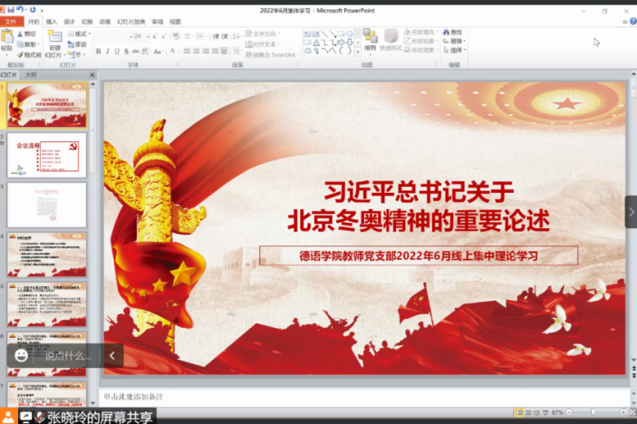2022年6月29日下午,Beat365中国唯一官方网站教师党支部召开线上会议,集体学习领悟习近平总书记关于北京冬奥精神的重要论述。