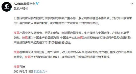 “日前我司官网发布的部分文字内容与事实严重不符,系公司内部管理不善所致 ,对此给大家带来的不适我司致以诚挚的歉意,”5月11日,“AORUS技嘉电竞”微博公开道歉。此前,技嘉在其官网上发文称,“坚持台湾制造 ,质量严格控管。不同于其他品牌,选择低成本、降低质量的方式请中国代工制造,技嘉致力于打造卓绝且高性能的零组件和笔记本电脑。”