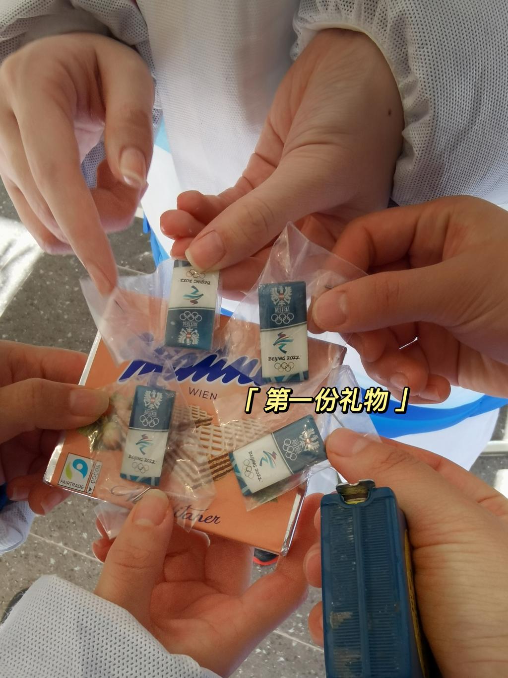 1月26日,奥地利代表团第一批运动员及工作人员抵达北京,这标志着我作为奥地利代表团助理的工作也正式开始了。我的第一个任务是帮助他们用奥地利元素来布置房间和走廊。带领我们的是一个叫Janine的小姐姐(通过跟她聊天得知她刚满25岁),她放着节奏感很强的音乐,带着我们边跳边贴奥地利国旗。这份工作其实并不轻松,尤其是我身高不够,还穿着防护服、戴着面罩、口罩和手套(防疫要求),一上午下来全身都湿透了。但这也换来了我的第一份礼物:来自维也纳的威化饼干和奥地利的专属徽章!B班的同事下班后还帮我们捎回了两盒完整的必胜客披萨!面对奥地利人的热情,真希望没有疫情,大家可以不在意社交距离地亲密交谈。