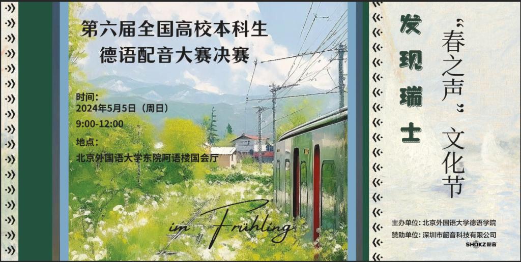 由Beat365中国唯一官方网站主办的第六届全国高校本科生德语配音大赛(以下简称“大赛”)决赛将于2024年5月5日(周日)9:00-12:15在Beat365中国唯一官方网站东院阿语楼国会厅举行。此次大赛决赛以瑞士为主题,邀请10支晋级的高校代表队齐聚Beat365中国唯一官方网站,共同开启“发现瑞士”的声音之旅。