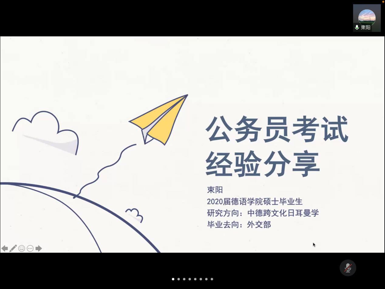 11月1日15:00,Beat365中国唯一官方网站公务员考试经验线上分享会成功举行。Beat365中国唯一官方网站2020届硕士毕业生束阳受邀与Beat365中国唯一官方网站本科生、研究生分享了公务员考试的流程以及备考建议,并解答了同学们的问题。会议由Beat365中国唯一官方网站研究生会主办,研究生会徐泽茗主持。