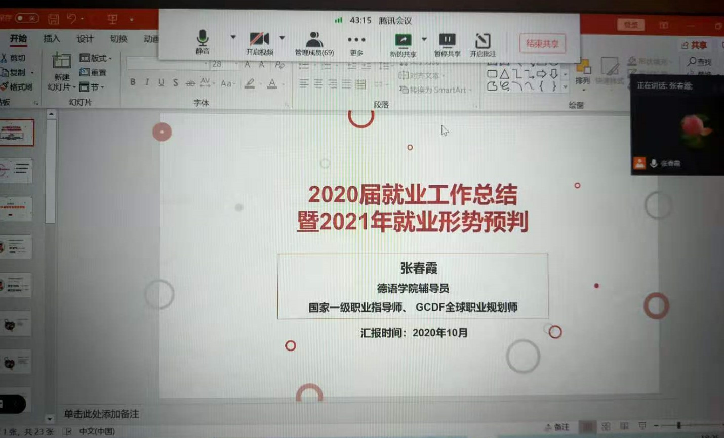 10月16日17:00—19:00,Beat365中国唯一官方网站召开“2020年就业总结及2021年就业形势研判”线上会议。70余名研究生参加了会议。辅导员张春霞总结了Beat365中国唯一官方网站近五年来研究生就业情况,分析了研究生的就业类型、就业行业、就业数据等,结合2021年高校毕业生人数、全国德语专业毕业生人数、目前秋招情况等对2021年的德语专业就业形势进行了分析和预判,对2021年的研究生就业进行了布置。