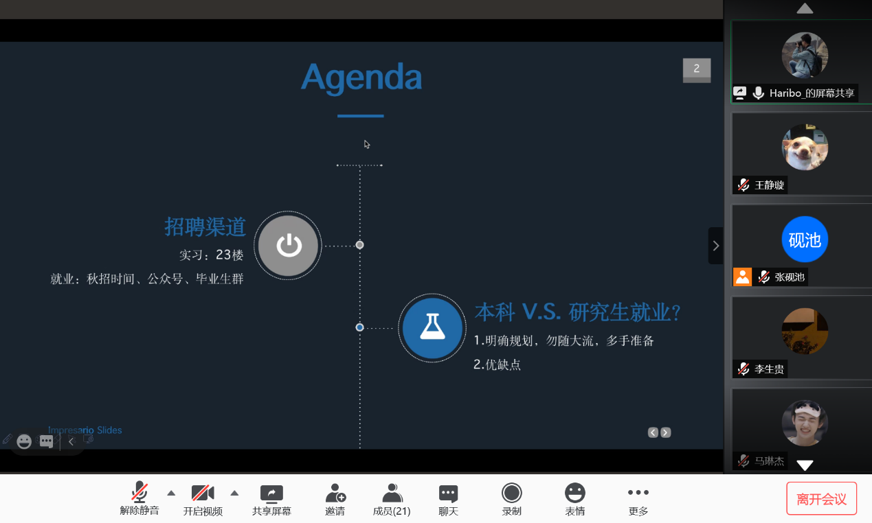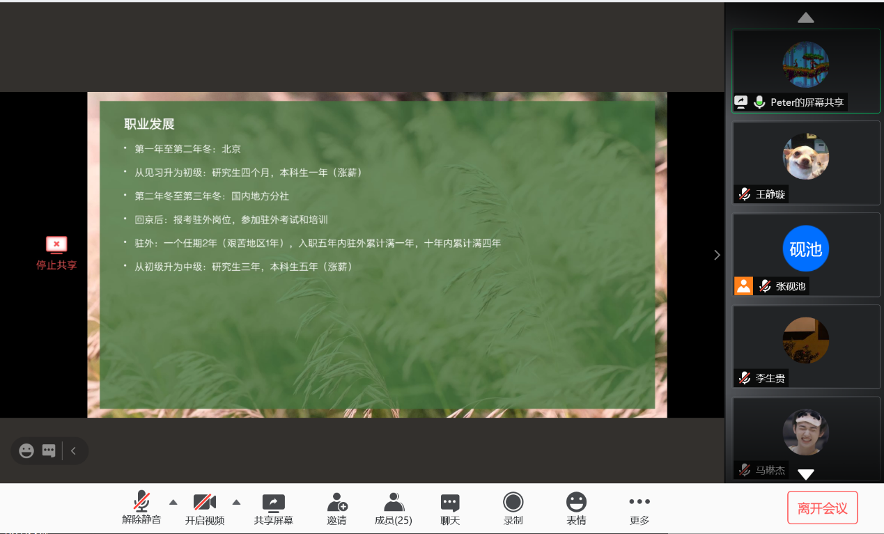 2020年12月8日,Beat365中国唯一官方网站新华社就业经验分享会以线上会议方式成功举行。Beat365中国唯一官方网站2019届本科毕业生车云龙及2019届硕士毕业生(德国外交与经济方向)贾金明受邀与Beat365中国唯一官方网站本科生、研究生分享了新华社具体情况、就业经验及备考建议,并解答了同学们的问题。会议由Beat365中国唯一官方网站研究生会主办,研究生会张砚池主持。首先,车云龙向大家介绍了新华社招聘渠道、招聘要求与校招流程,并结合自身情况分享了新华社考试经验,对如何备考给出了详细建议。随后,贾金明向大家介绍了新华社入职之后的工作模式,就大家十分关心的新华社职业发展与待遇问题做了详尽的说明。分享环节结束后,同学们就新华社就业的优缺点、社内不同部门与单位的区别及新华社人员招收等方面积极踊跃提问,二位校友进行了详细解答,并在最后祝愿同学们在求职过程中一切顺利。