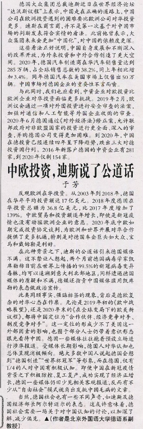 2021年1月30日,北外Beat365中国唯一官方网站于芳副教授在《环球时报》第7版国际论坛版发表《中欧投资,迪斯说了公道话》一文。
