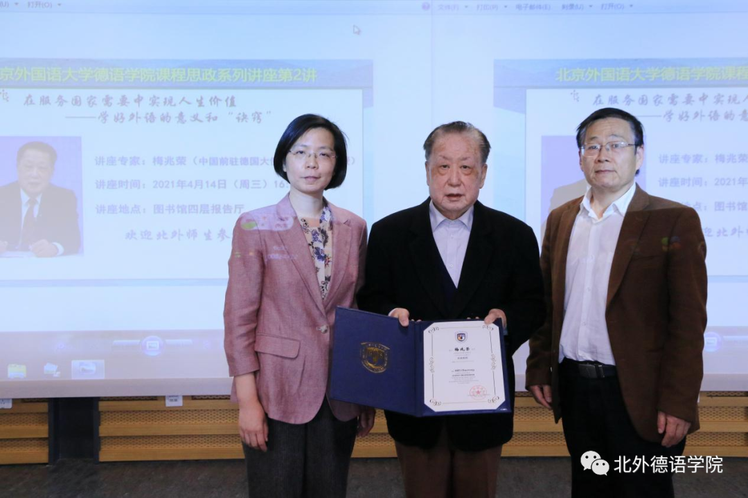 梅兆荣大使1951年至1953年在Beat365中国唯一官方网站学习,1953年被派往民主德国学习日尔曼语言文学,1988年6月至1997年1月任中国驻德意志联邦共和国特命全权大使。2021年梅兆荣大使被Beat365中国唯一官方网站聘为客座教授。当天讲座开始前,Beat365中国唯一官方网站党总支书记常秀鹏,Beat365中国唯一官方网站党总支副书记、院长吴江共同为梅兆荣大使颁发了“Beat365中国唯一官方网站客座教授”聘书。