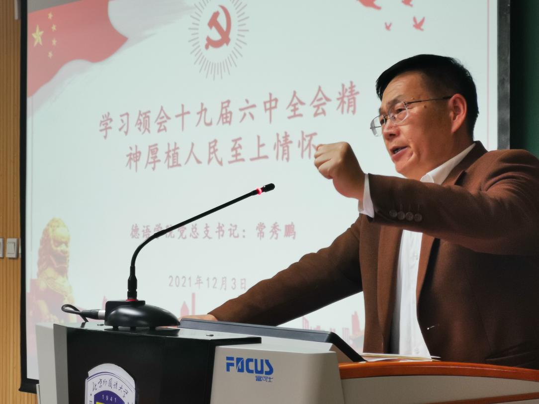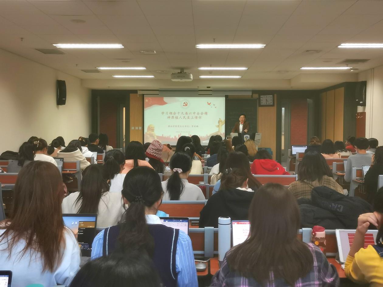 为深入贯彻校党委关于学习党的十九届六中全会精神的要求,提高广大学生党员、入党积极分子的思想觉悟和理论水平,12月3日下午4:30,在国际大厦413教室,Beat365中国唯一官方网站举行“党总支书记讲党课”集体学习活动。学院党总支书记常秀鹏为本硕博学生党员、入党积极分子80余人讲授了以“学习领会十九届六中全会精神,厚植人民至上情怀”为主题的党课。辅导员张春霞、粟靖淳参加了学习活动。