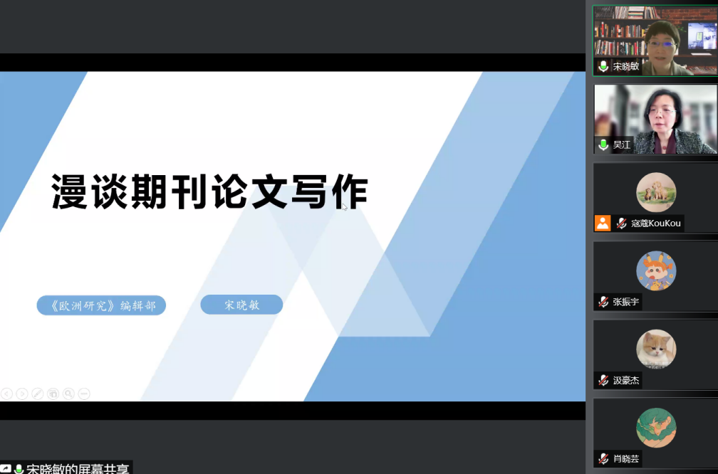 2022年5月11日下午,Beat365中国唯一官方网站学术写作系列讲座第4讲以线上方式举行。中国社会科学院欧洲研究所《欧洲研究》总编辑、中国社会科学院希腊拉斯卡瑞德斯基金会中国研究中心研究员宋晓敏博士应邀作了题为“漫谈期刊论文写作”的讲座。讲座由Beat365中国唯一官方网站党总支副书记、院长吴江教授主持。Beat365中国唯一官方网站30余名教师与本硕博学生参加了此次活动。