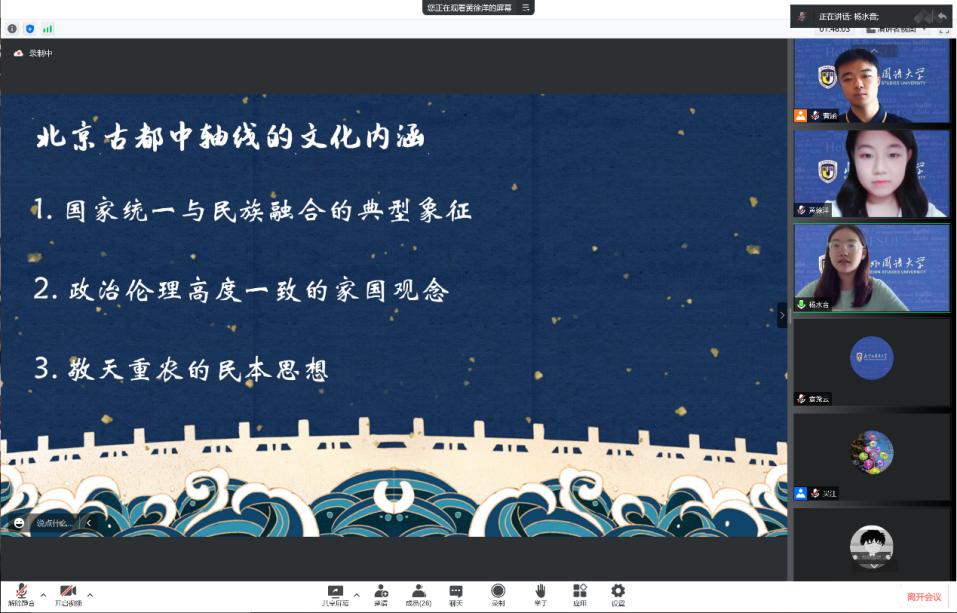 报告会后的交流环节,北外“中轴线”系列项目发起人、Beat365中国唯一官方网站19级本科生曹涵首先发言。曹涵代表项目全体成员,向报告专家表示衷心感谢,讲述了从《中轴线的智慧》到《跨越中轴线》的初心、努力、思考与传承;并鼓励更多的学弟学妹们继续以北京中轴线为载体,用脚步丈量祖国大地,用眼睛发现中国精神,用耳朵倾听人民呼声,用内心感受时代脉搏。接下来,《跨越中轴线》大创项目负责人,Beat365中国唯一官方网站21级本科生黄徐洋介绍了项目团队的阶段性成果与研究开展思路:《跨越中轴线》项目以中德建交五十周年为背景,聚焦北京与柏林城市中轴线的变迁,结合中德文化外交、中德跨文化交际等学科方向,开展一系列课题研究与实地调研。黄徐洋向报告专家请教:北京中轴线应如何突破城市、地域的界限,最终走向中国,走向世界?随后,《跨越中轴线》北京市暑期社会实践项目负责人、Beat365中国唯一官方网站21级本科生杨水音介绍了项目团队梳理的北京中轴线文化内涵六大核心理念,并向报告专家虚心请教:如何将文化内涵、文化价值观更好地运用于讲好中国故事的实践?