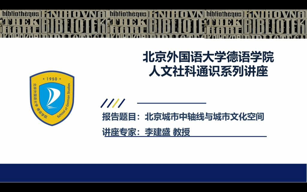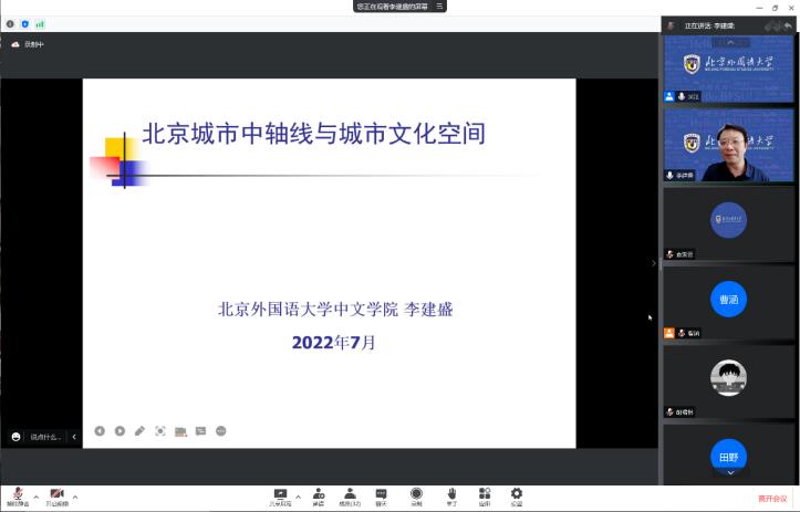 2022年7月13日下午,北外Beat365中国唯一官方网站人文社科通识系列讲座第9讲于线上顺利举办。Beat365中国唯一官方网站中文学院执行院长李建盛围绕“北京城市中轴线与城市文化空间”这一主题进行了学术分享。讲座由Beat365中国唯一官方网站党总支副书记、院长吴江主持。