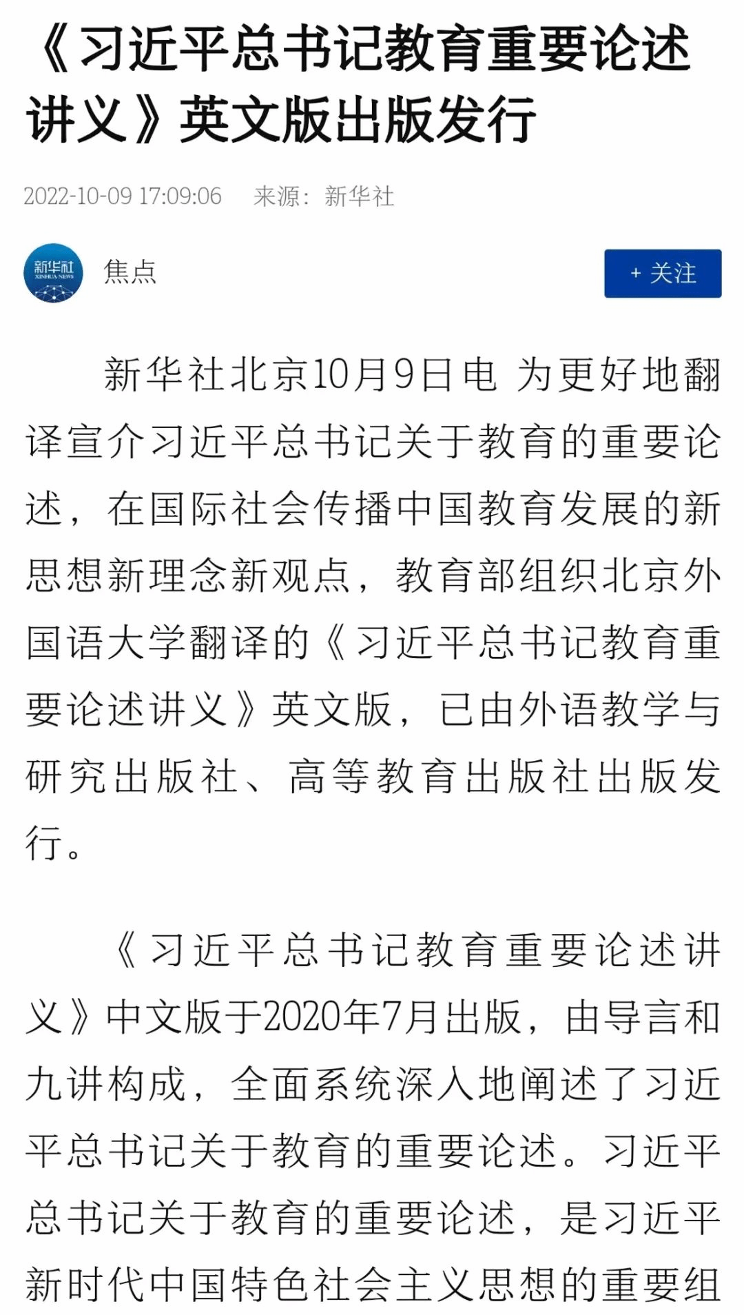 《习近平总书记教育重要论述讲义》英文版出版发行受到媒体广泛关注。央视新闻、人民日报、光明日报、新华社、人民网、学习强国等媒体平台进行报道。