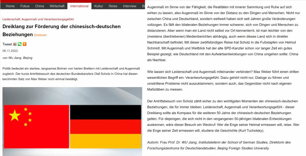 北外Beat365中国唯一官方网站书记、院长吴江教授应中国网邀约用德语就朔尔茨访华发表评论文章。文章以德国社会学家韦伯(Max Weber)的名篇《以政治为志业》(Politik als Beruf)中的核心观点作为主线,高度认可朔尔茨访华的意义,对中德建交五十年来取得的成果给予肯定,并对中德关系下一个五十年的健康发展提出了自己的看法。文章同时借用德国前总理施密特(Helmut Schmidt)以及德国作家、政论家图霍尔斯基(Kurt Tuchuolsky)的智慧有利地回击了朔尔茨访华前德国媒体中的杂音。评论文章刊发后反馈颇佳,在中国网海外平台引发热烈关注,国外读者留言众多,创了中国网德文评论文章互动的新高。