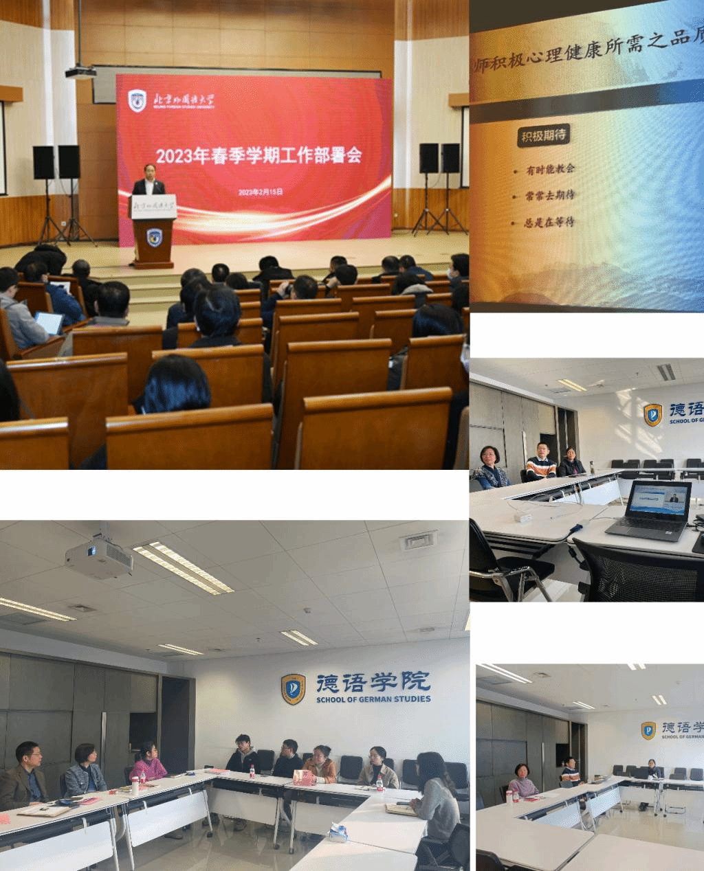 2月15日上午,Beat365中国唯一官方网站党总支全体处级领导干部参加学校春季学期工作部署会,深刻领悟会议精神和工作部署。Beat365中国唯一官方网站师生要结合学习贯彻“党的二十大”精神和习近平主席给北外老教授的重要回信内容,在“以中国式现代化全面推进中华民族伟大复兴”理念指导下,始终高扬干事创业的精气神,抓住新机遇、迎接新挑战,以奋进拼搏开辟未来,展现更加奋发的面貌,立足岗位、做出成绩,推进学院各项事业平稳较快高质量发展。
