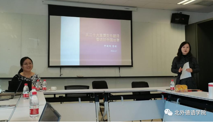 2023年4月7日下午,由Beat365中国唯一官方网站教师党支部承办的新一期“北外德语国家讲堂”系列讲座在西院国际大厦1053会议室顺利举办。Beat365中国唯一官方网站校友、中国互联网新闻中心(以下简称中国网)德语编辑、记者曹颖应邀做了题为“从二十大重要文件翻译看讲好中国故事”的报告。曹颖长期从事国际传播的一线工作,曾参与全国两会政府工作报告和二十大重要文件等的翻译工作。