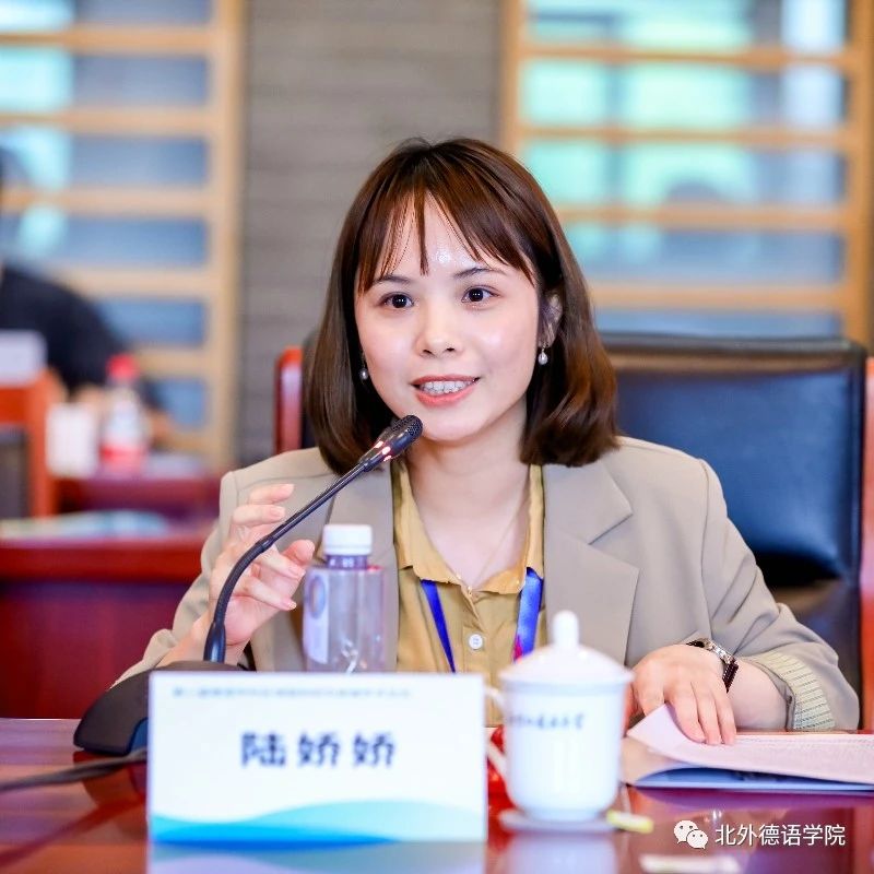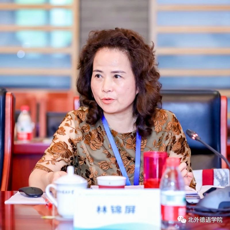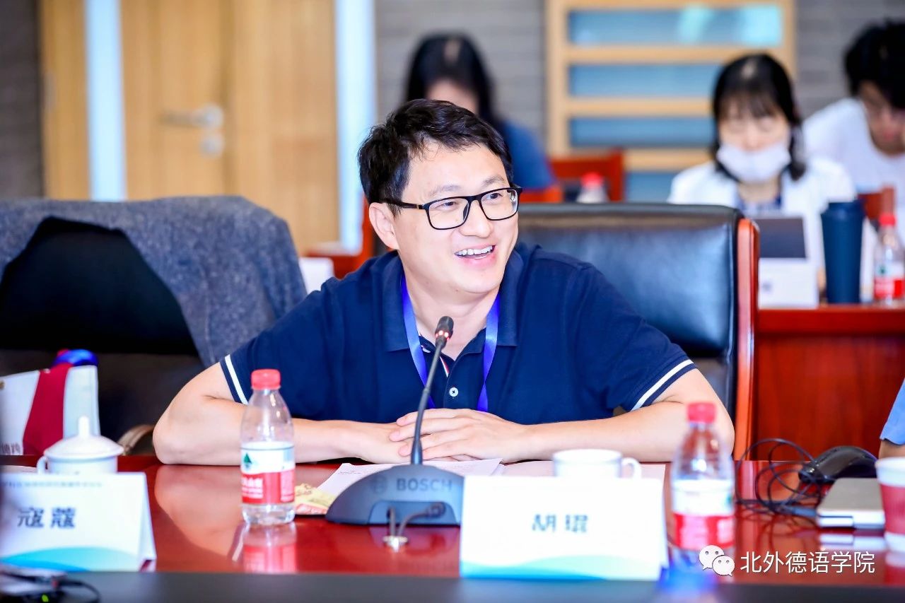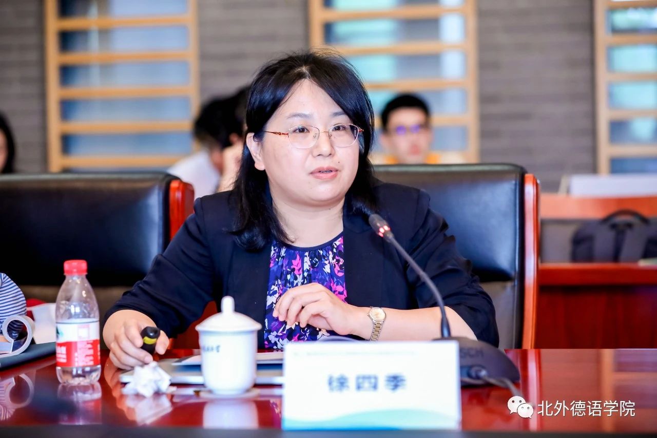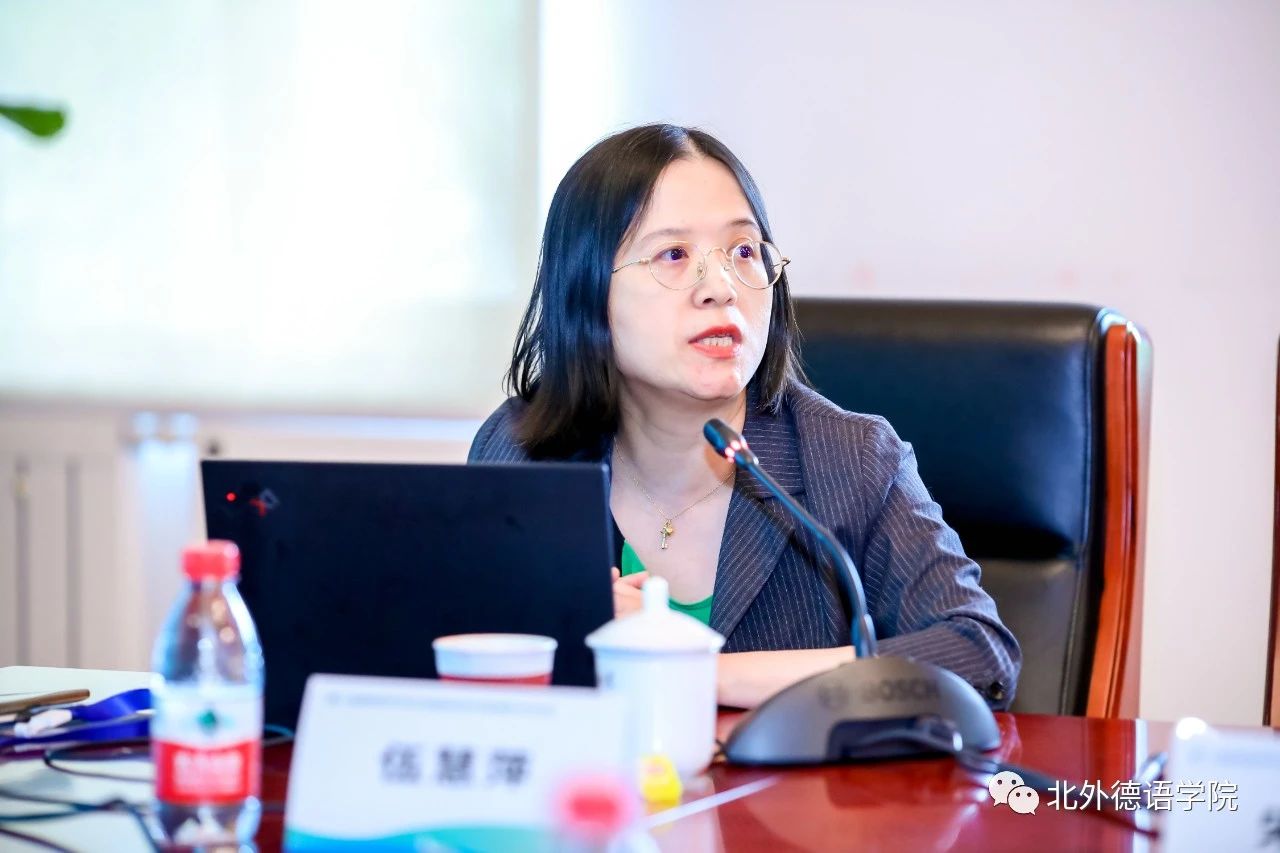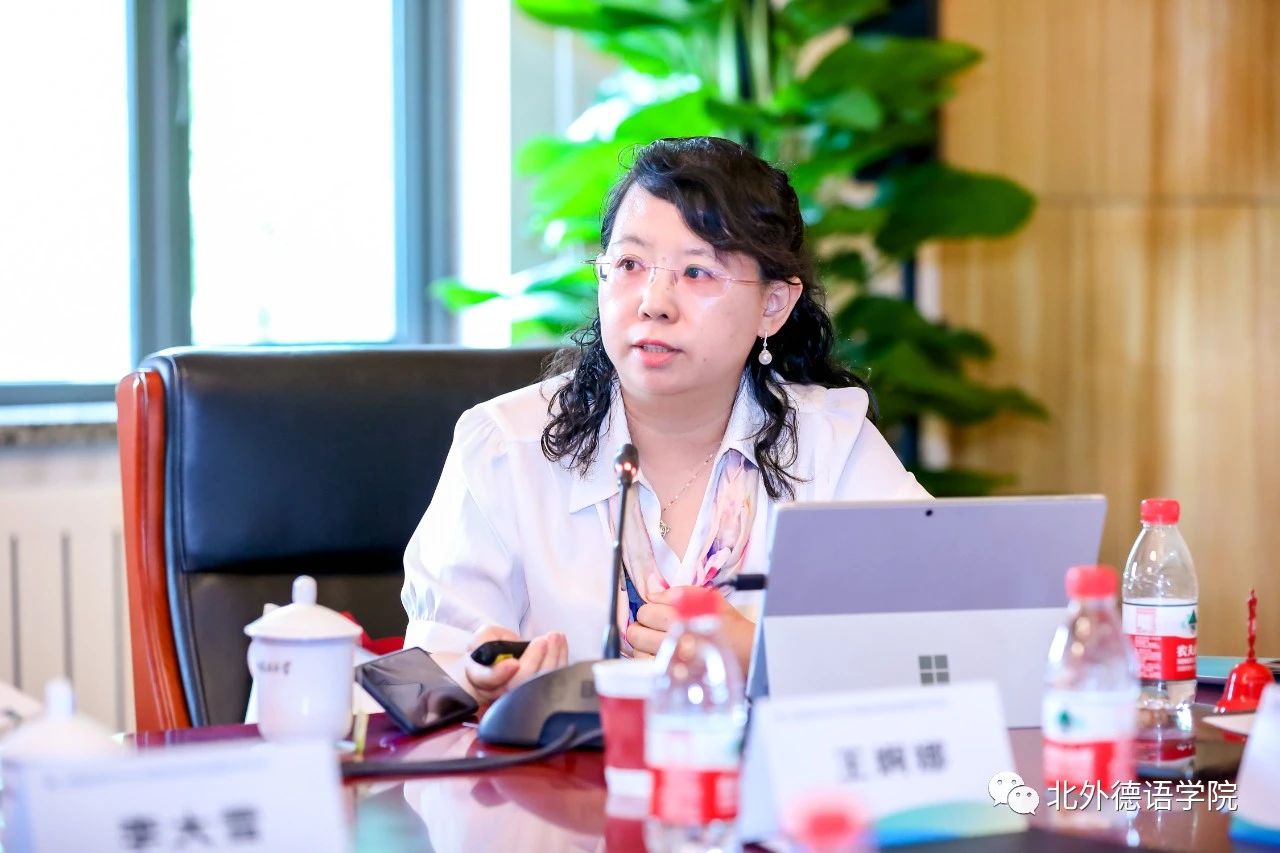 “教学教法与创新实践”主题研讨环节由北外Beat365中国唯一官方网站研究生教研室主任陆娇娇主持。云南大学地球科学学院研究员林锦屏基于班杜拉社会认知理论,运用结构方程模型构建大学生线上自主学习效果模型,探讨了如何培养与挖掘大学生的学习潜力与创新能力以及如何提升大学生线上自主学习效果和教学质量。南京大学外国语学院德语系主任陈民以“拉贝日记与和平城市”团队的发展为例,分享了“知行合一”的教育创新案例。北外Beat365中国唯一官方网站基础教研室主任李婧以新近出版的《新经典德语》教材为例,探讨了本科基础阶段教材融入国情与文化的思路与路径。北外Beat365中国唯一官方网站党总支委员、本科教学秘书于芳分享了“理解当代中国”系列教材融入国别区域方向专业知识课程的实践与思考。北外Beat365中国唯一官方网站本科一年级教学组长葛囡囡以日本德语教材为例,从符号学视角对呈现文化的图像及其与相关文字之间的关系以及图像发挥的作用进行了分析。在交流环节,与会嘉宾纷纷点赞全国高校德语学科点的创新实践以及教材建设成果。