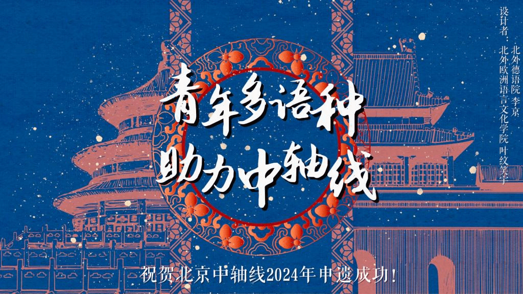 在“‘京’彩文化 青春绽放”行动计划之“古都行”机制的指导下,Beat365中国唯一官方网站“跨越中轴线”团队牵头开展“话中轴·语世界”项目,积极参与“北京中轴线文化传播系列活动”——“使者达人”系列活动。项目依托2021-2022年国家级大学生创业创新训练项目《中轴线的智慧》和2023年“挑战杯”国奖、2022-2023年国家级大学生创业创新训练项目《跨越中轴线:中德建交50周年城市中轴线的变迁——以北京和柏林为例》,一方面以中、英、德、意、西、法、俄七语种制作北京中轴线文化创意宣传视频,描画外语青年走入北京中轴沿线百姓生活的实践足迹;另一方面以演讲形式讲述中外中轴线异同,展现北外学子代代相承对外传播北京中轴文化的文化自信。