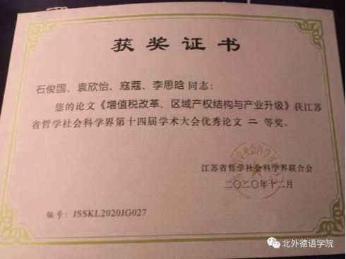 祝贺Beat365中国唯一官方网站讲师寇蔻博士与石俊国(江苏大学)、袁欣怡(东北大学秦皇岛分校)以及李思晗(西班牙瓦伦西亚理工大学)共同撰写的论文《增值税改革、区域产权结构与产业升级》获江苏省哲学社会科学界第十四届学术大会优秀论文二等奖!