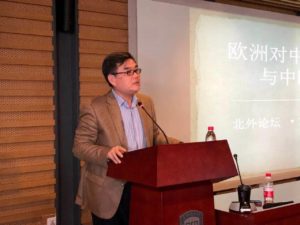 2017年12月20日,北外德语国家与欧洲研究高端论坛第六讲在图书馆四层学术报告厅举行。中国国际问题研究院欧洲研究所所长崔洪建研究员做了题为“欧洲对中国的意义与中欧关系”的报告。中国社会科学院学部委员、国际学部副主任、北外冠名讲席教授周弘女士主持了报告会。