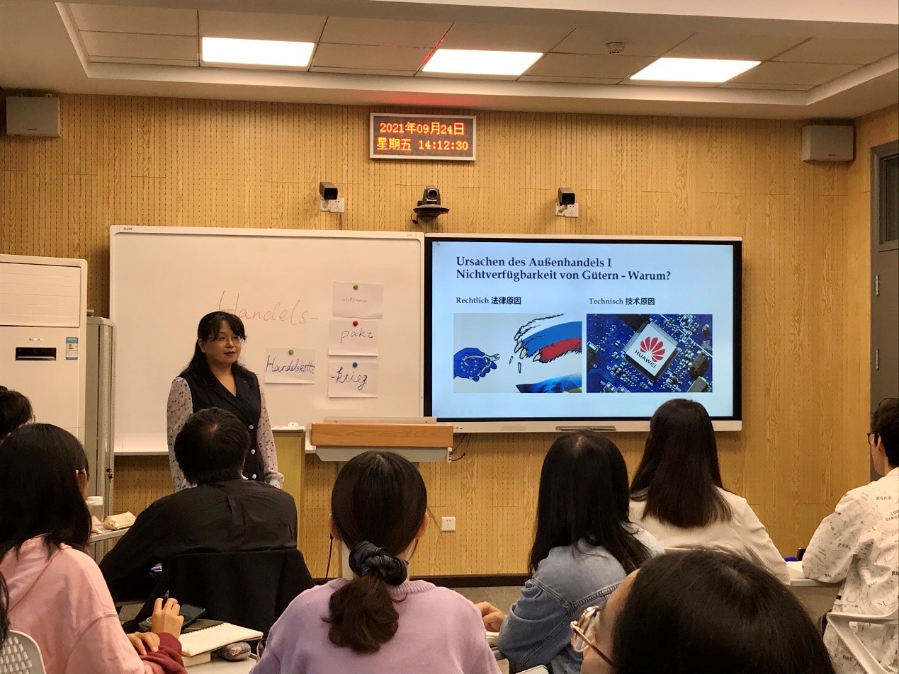 徐四季老师的公开课在“内容—语言融合”教学理念指导下,采用问题导向式教学方法,讲授对外贸易的重要意义以及国与国之间进行对外贸易的成因。探究式课堂教学同时贯穿了一条“辅线”——对世界贸易发展史的回溯。其中,丝绸之路的起源、《共产党宣言》(德文版)对早期资本家开拓世界市场的论述、美国对我国的技术封锁等内容贯彻了课程思政的方针,旨在潜移默化中坚定学生的共产主义信念,增强他们的民族自信心和使命感,培养既具有国际视野,又具有家国情怀的外语人才。