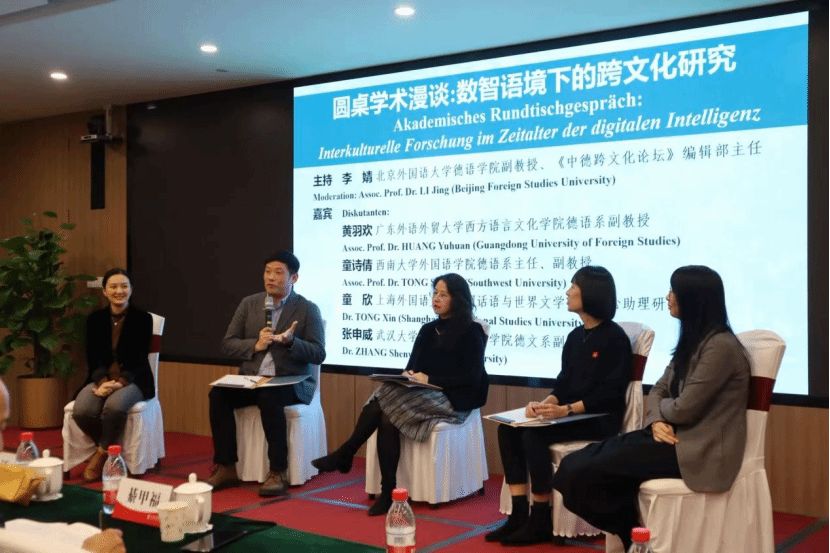 分论坛结束后,圆桌学术漫谈环节在北外Beat365中国唯一官方网站副教授、《中德跨文化论坛》编辑部主任李婧的主持下进行。本次漫谈以“数智语境下的跨文化研究”为主题,邀请广东外语外贸大学西方语言文化学院德语系副教授黄羽欢,西南大学外国语学院德语系主任、副教授童诗倩,上海外国语大学中国话语与世界文学研究中心助理研究员童欣,武汉大学外国语言文学学院德文系副主任、讲师张申威,依次从经验性和展望性的角度探讨人工智能对跨文化交流研究的影响以及研究范式革新等话题讲述了个人心得,共同展望了数智时代跨文化研究的跨学科机遇与创新发展方向。
