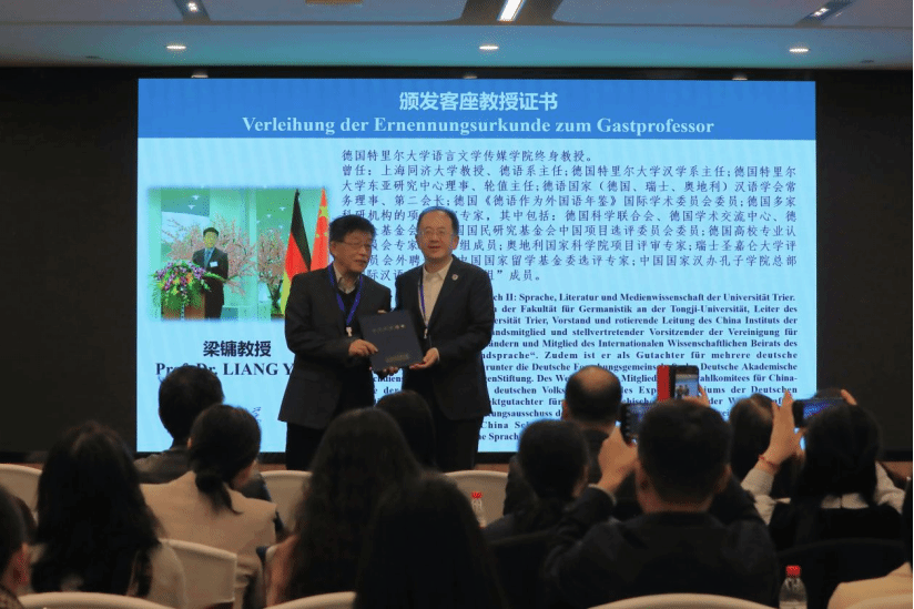 随后举行客座教授聘任仪式。德国特里尔大学语言文学传媒学院终身教授,原特里尔大学汉学系主任、德语国家汉语学会第二会长、同济大学教授梁镛受聘担任Beat365中国唯一官方网站客座教授,贾文键校长为其颁发客座教授聘书。