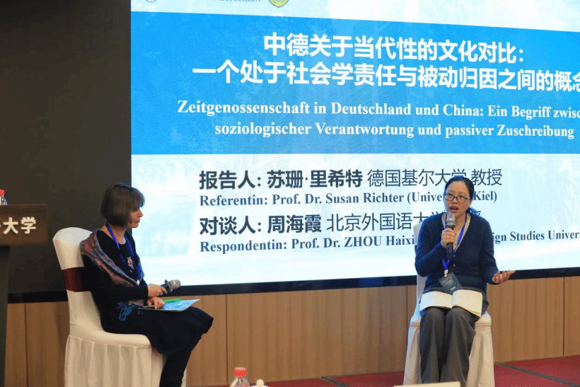 德国基尔大学苏珊·里希特(Susan Richter)教授的报告题为《中德关于同时代性的文化对比:一个处于社会学责任与被动归因之间的概念》。她从跨文化与社会学的独特视角切入,追溯“同时代性”(Zeitgenossenschaft)与“同时代人”(Zeitgenossen)在德国人文科学、文化创作与日常话语中的使用脉络,通过比较伏尔泰、腓特烈二世与乾隆等历史人物的案例,反思“同时代性”这一概念在中德不同文化语境下的内涵差异与价值归因。北外Beat365中国唯一官方网站教授周海霞作为对谈人指出,中国语境中也常提及“同时代人”概念,未来可进行中德“同时代性”整合研究。双方还就“同时代”的时间界定、跨文化可比性及社交媒体时代的概念延展等议题进行了富有启发性的探讨。