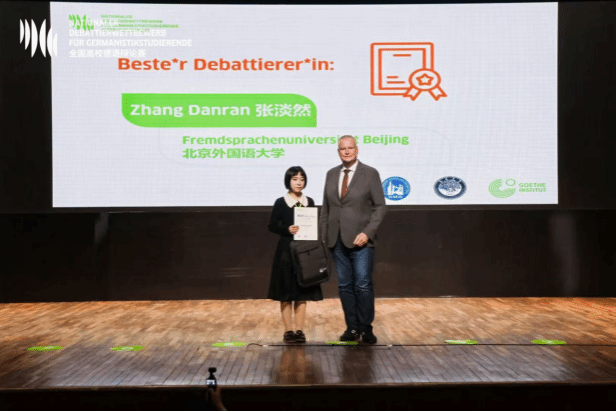 11月1日,决赛在南昌大学线下举行,李宁锡和张淡然凭借严谨的逻辑推理、生动的德语表达以及出色的团队协作,赢得了评委和观众的好评与掌声,获得全国二等奖。张淡然同学包揽大赛三个单项奖中的两项,获得“最佳辩手”和“最佳语音奖”。