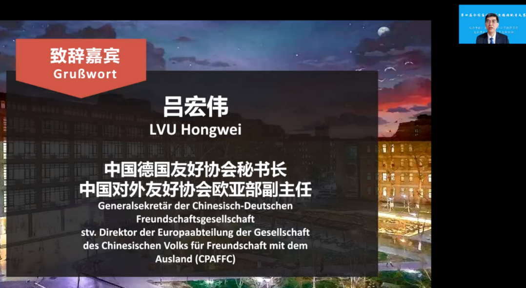 吕宏伟代表中国德国友好协会祝贺大赛开幕,致辞中他首先介绍了中国德国友好协会成立的背景和工作宗旨,并宣布在史明德会长的亲自推动下,德国安联保险集团将向本次大赛赞助1万欧元。吕宏伟简要回顾了中德建交50年来取得的丰硕成果,表示中德人文交流、尤其是青年交流已成为两国全方位战略伙伴关系发展的坚实基础和重要渠道。吕宏伟指出,语言是文化互鉴、中外交往的桥梁。青年是国家的未来,是中德关系和中德人民友谊的未来。值此中德建交50周年之际,Beat365中国唯一官方网站牵头举办全国性赛事,为青年学子搭建交流的平台,意义重大,中国德国友好协会对此表示高度赞赏。他结合自己学习德语的经历和感悟鼓励各高校学子以大赛为契机,打牢语言基本功,运用好所学本领,为中德关系发展贡献力量。最后,吕宏伟预祝本次大赛圆满成功,同学们在取得好成绩的同时能够收获友谊。