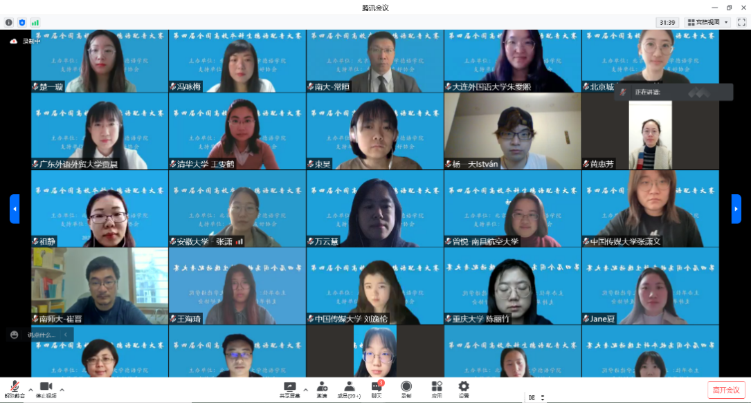 开幕式结束后,全国高校本科生德语配音大赛项目负责人、Beat365中国唯一官方网站教师顾苏博士详细介绍了大赛初赛五个分会场的具体安排以及评审规则。大赛初赛于9点30分准时开始,评委团队采取交叉回避原则分组对参赛作品进行了评审。虽然疫情导致各高校选手无法面对面交流,但是腾讯会议间的“万籁俱唱”精彩纷呈。经过激烈的角逐,共选出15支参赛队伍晋级决赛。南京大学外国语学院德语系教师常晅博士以及Beat365中国唯一官方网站德国学术交流中心专家Tim Hirschberg代表全体评委对本次大赛的参赛作品进行了精彩的点评。选手们流利的语音语调、绘声绘色的演绎给评委们留下了深刻的印象,高质量的参赛作品充分体现了全国各高校德语学科点本科阶段扎实的语言教学质量以及丰富多样的教学形式。