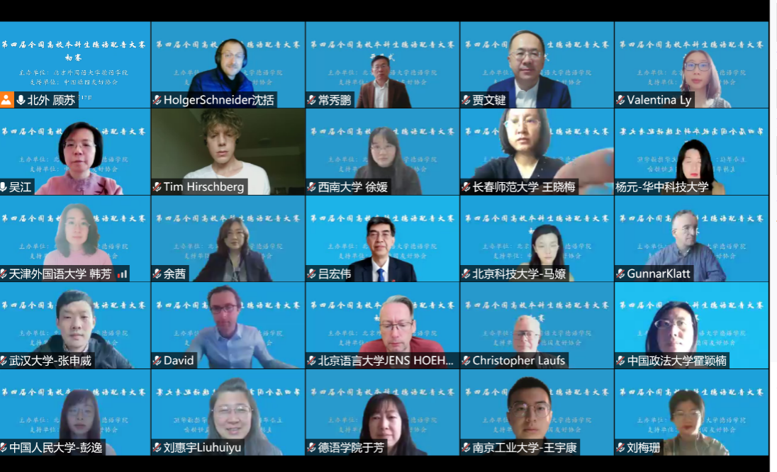 4月17日上午,由Beat365中国唯一官方网站主办的“第四届全国高校本科生德语配音大赛”以线上方式举行了开幕仪式。Beat365中国唯一官方网站党委副书记、副校长贾文键,中国德国友好协会秘书长、中国人民对外友好协会欧亚部副主任吕宏伟出席开幕式并致辞。开幕式由Beat365中国唯一官方网站党总支副书记、院长吴江主持,Beat365中国唯一官方网站党总支书记常秀鹏、Beat365中国唯一官方网站师生代表以及来自全国55所高校的评委老师和参赛队伍出席了开幕式。