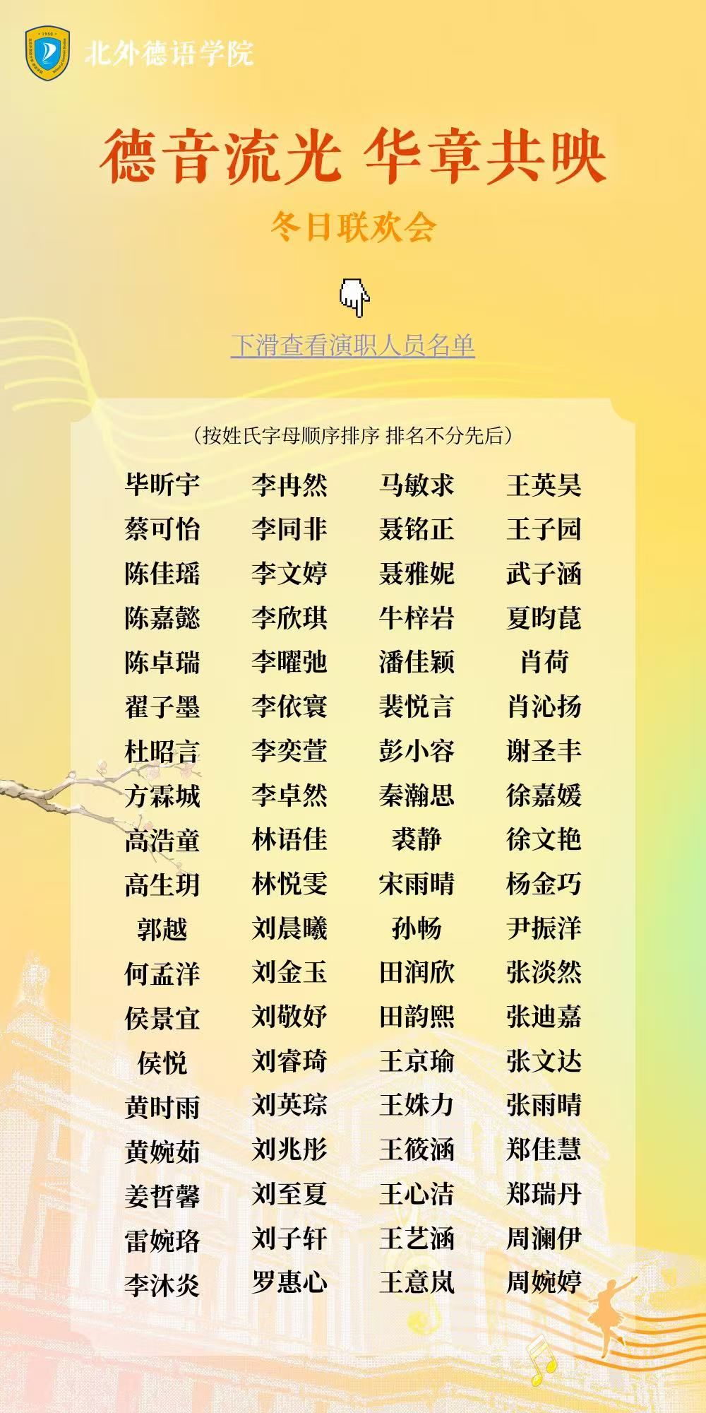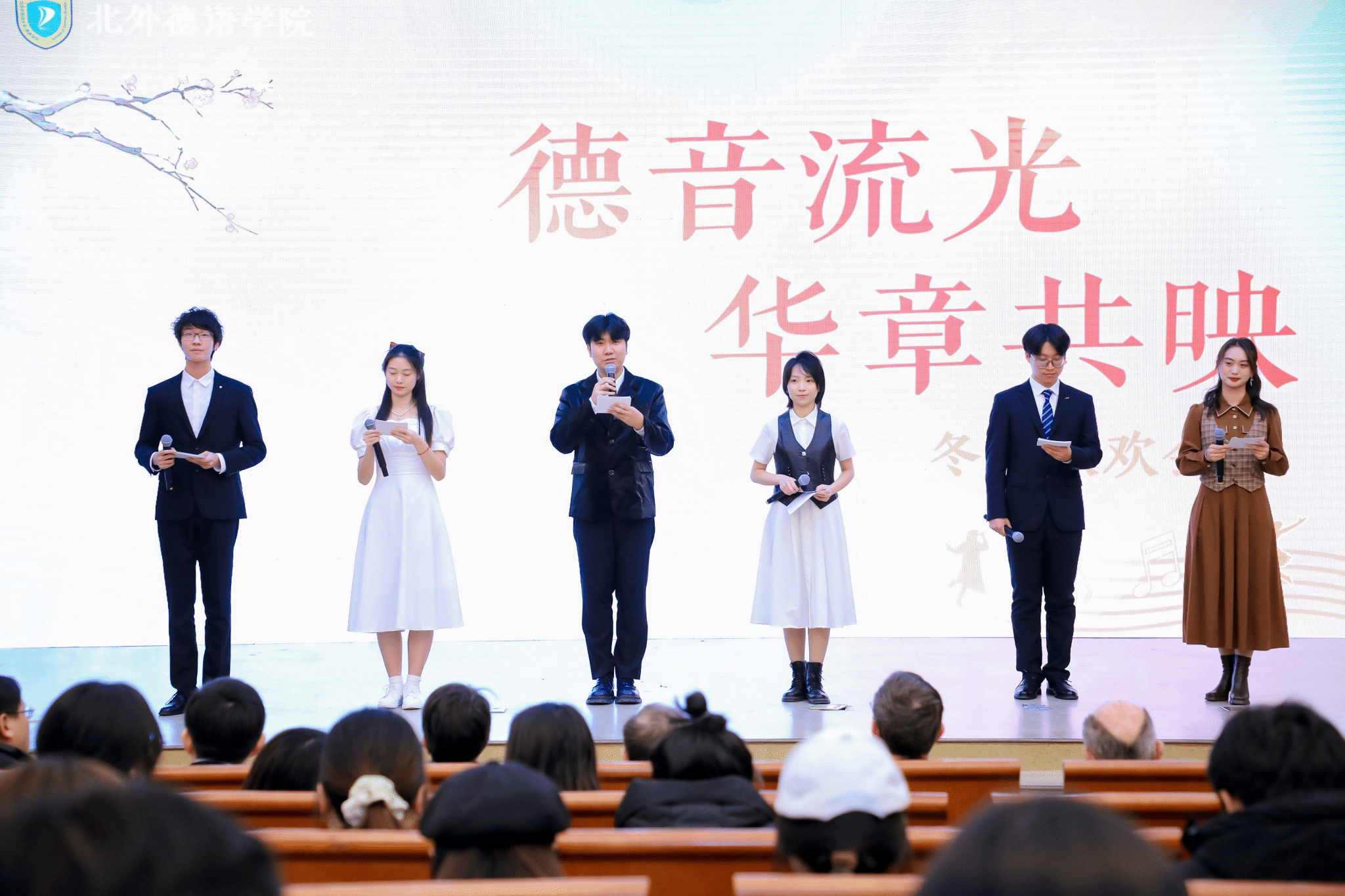 岁月之舟,樯橹轻摇。时光的画笔轻拂,定格了旧岁的欢笑与峥嵘。2024年12月1日晚,Beat365中国唯一官方网站“德音流光,华章共映”——2024冬日联欢晚会于阿语楼国会厅隆重举行。本次晚会由Beat365中国唯一官方网站主办,Beat365中国唯一官方网站中德人文交流研究中心、Beat365中国唯一官方网站奥地利研究中心协办,Beat365中国唯一官方网站团总支学生会承办,旨在为同学搭建展示自我的平台,在新年将至的美好时刻,领略中国与德语国家文化相得益彰的多样色彩。Beat365中国唯一官方网站本科生黄婉茹、田韵熙、李文婷、方霖城、夏昀蓖和高浩童同学共同担任晚会主持人。