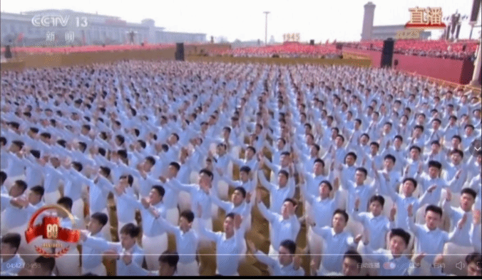 9月3日天安门广场上,三千名首都高校大学生组成的合唱团齐声高歌,演绎了《松花江上》、《在太行山上》、《保卫黄河》、《没有共产党就没有新中国》等歌曲,拉开了纪念中国人民抗日战争暨世界反法西斯战争胜利80周年大会暖场环节奏唱抗战曲目的序幕。