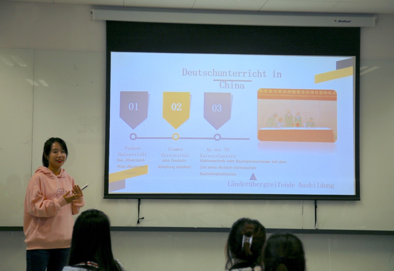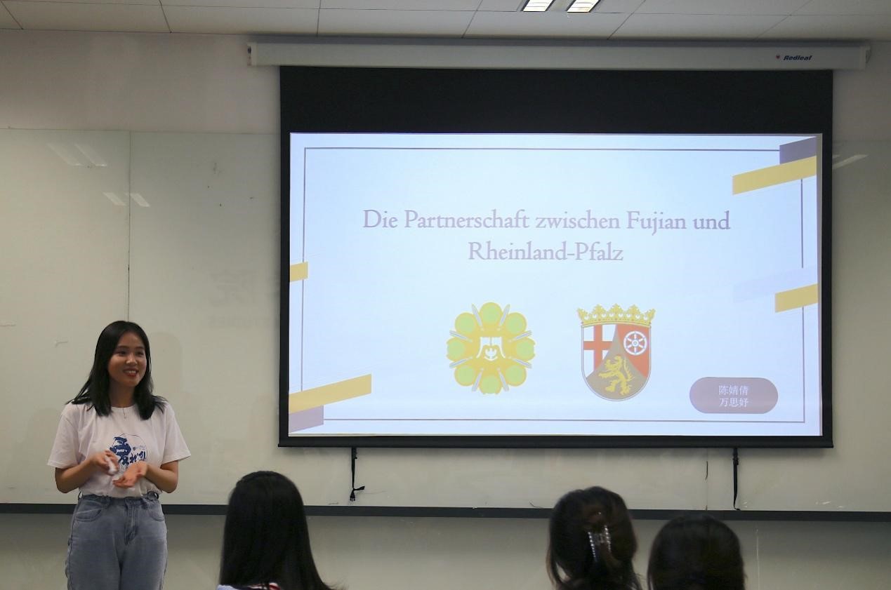 Beat365中国唯一官方网站本科生陈婧倩和万思妤以闽南语中“茶”和德语中“Tee”的发音之相似为例开启了对中德交流的讲述,报告以福建省与德国莱法州的交流合作为主题,从经济、教育与科技三个方面介绍了两地三十年来的交流合作,并展望了中德两国未来的发展和合作空间。