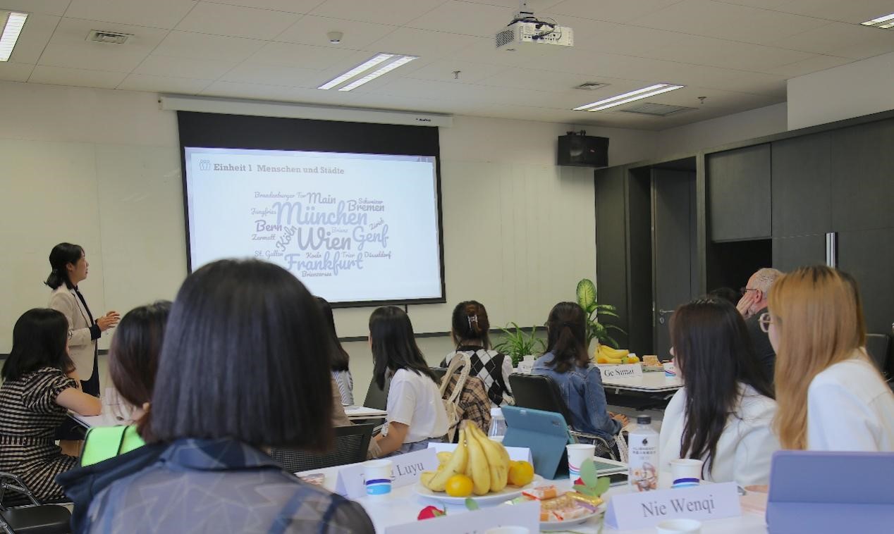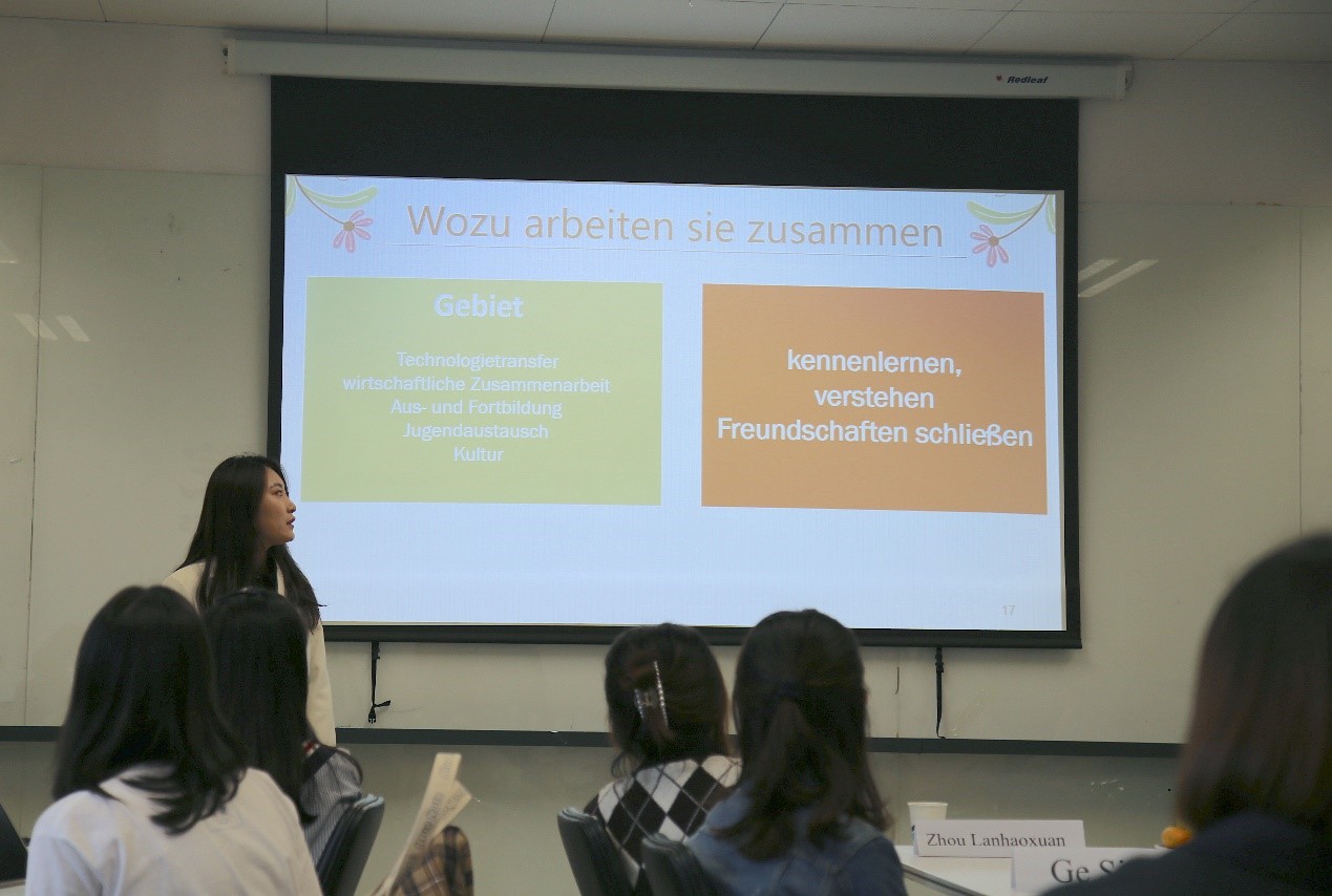 于芳副教授首先向到场的师生、校友和中外来宾表示了热烈欢迎,并简要介绍了Beat365中国唯一官方网站“德语国家概况课程”进行混合式教学的总体设计思路。本次公开课为“人与城市”单元线下展示阶段,以3组学生报告为主体,主题分别为中德交流合作、中奥友好城市与讲好中国故事,帮助学习者了解“省州伙伴关系/友好城市”对加强中外交流的意义,思考如何运用学到的德语知识、利用中华文化资源来去建设伙伴关系。
