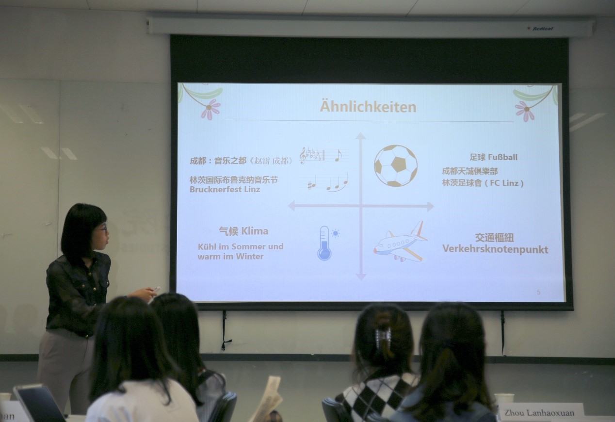 接下来,Beat365中国唯一官方网站本科生郭沈嘉乐与萧瑀莘(台湾交换生)为大家介绍了“锦城”成都与奥地利著名城市林茨的诸多共同之处,以及两个城市在医疗科技、文化教育等等方面的合作交流。2021年恰逢中奥建交50周年,同学们祝福两国友谊长存,倡议以合作共同应对全球挑战。