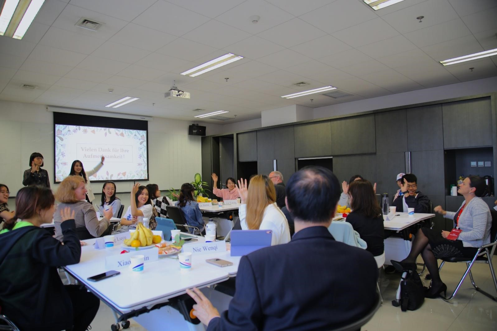 课程展示结束后,返校的系友和德方特邀嘉宾加入各小组讨论之中,与同学们进行了广泛深入的交流。