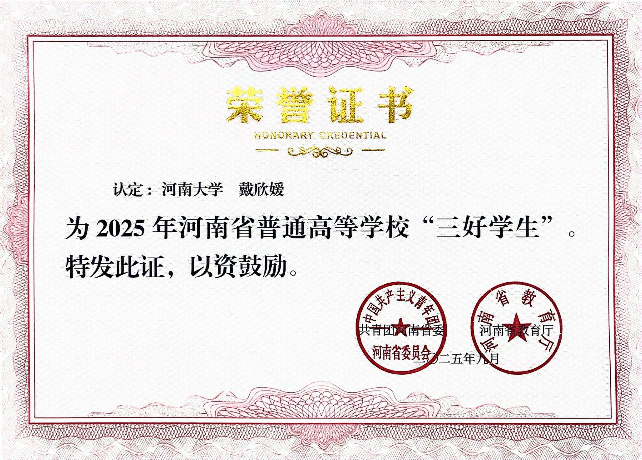 在她看来,好成绩不是终点,而是让自己有底气去探索更多可能的起点。因此,从大一到大三,她的专业成绩稳居专业第一,大三学年20门专业课中,有19门专业课取得满绩点,不仅获评“河南省三好学生”,还凭借过硬的学业表现与综合素质获得了推荐优秀应届本科毕业生免试攻读硕士学位研究生的资格。