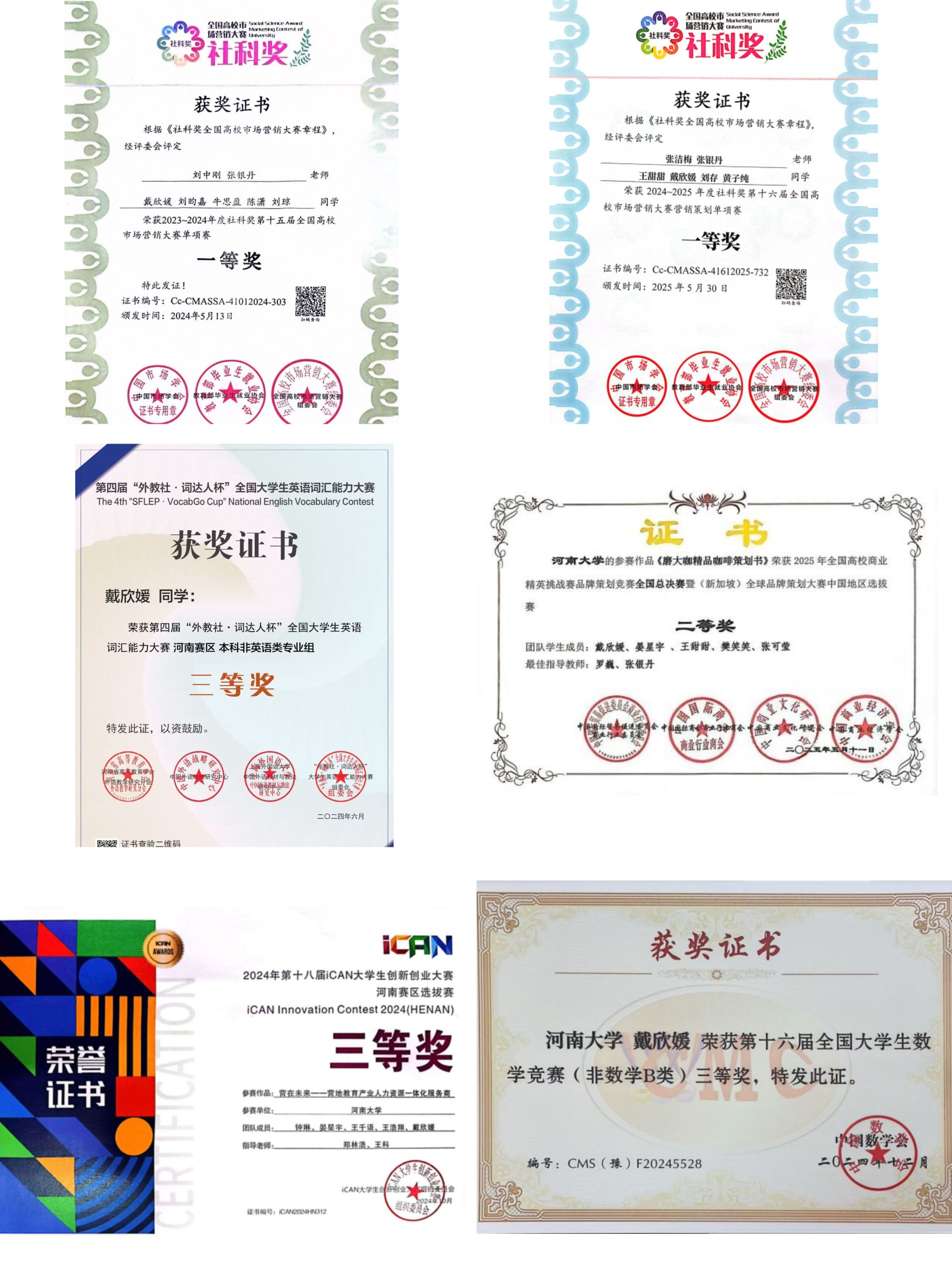 在校期间获得多项荣誉奖项,曾获国家奖学金、河南省普通高等学校三好学生、蜜雪冰城奖学金以及欧博abg官方网站奖学金、三好学生、优秀学生干部等荣誉奖项。曾获社科奖全国高校市场营销大赛国家级一等奖、全国商业精英挑战赛品牌策划大赛国家二等奖、iCAN大学生创新创业大赛河南省三等奖、全国大学生数学竞赛河南省三等奖等,参与河南省高校人文社会科学研究课题、河南省科技智库调研课题、开封市哲学社科规划调研课题及一项大学生创新创业训练项目。