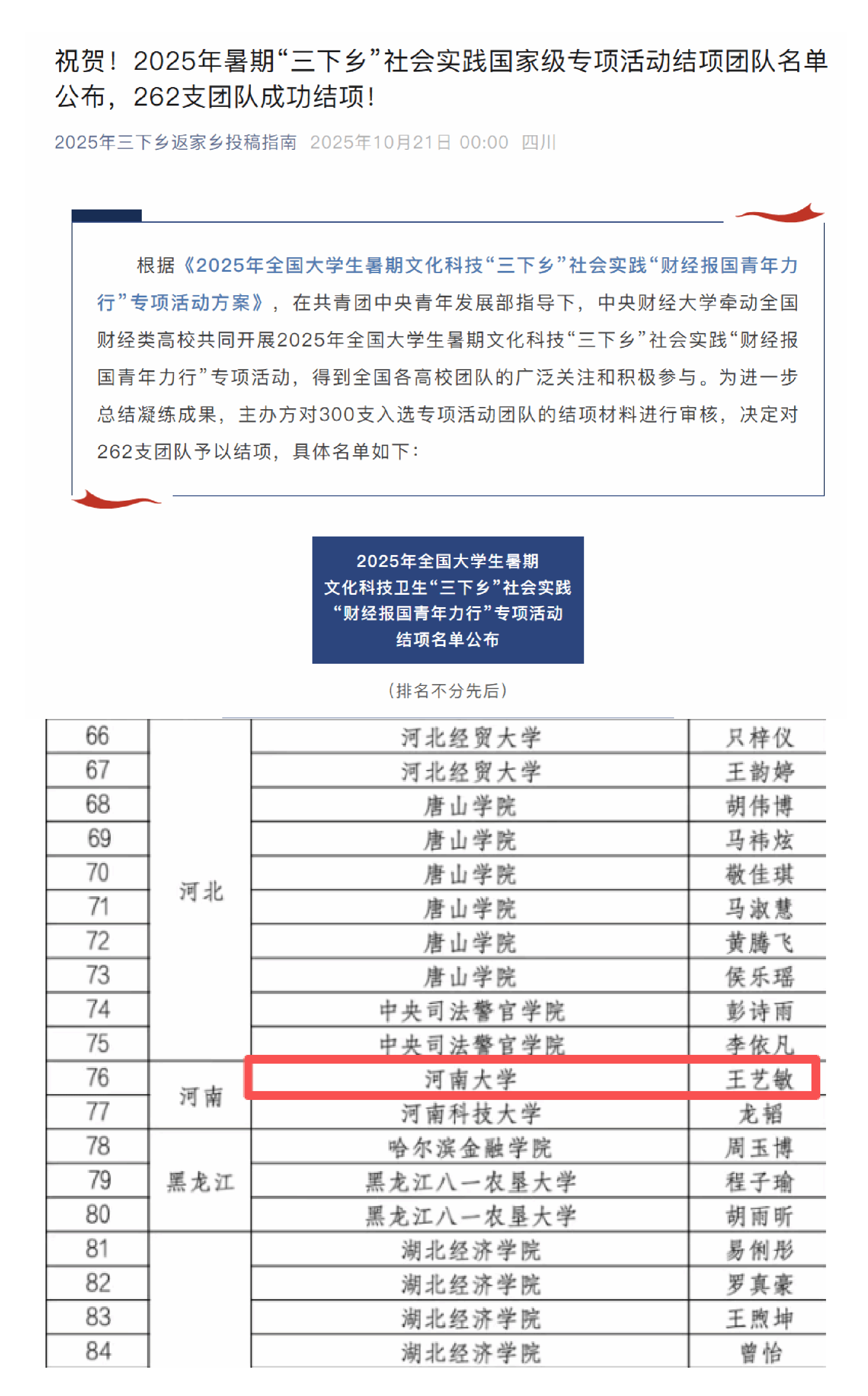近日,2025年全国大学生暑期文化科技“三下乡”社会实践“财经报国 青年力行”专项活动结项名单正式发布。欧博abg官方网站申报的《智汇“枣”业,数赋红企:好想你公司数字化转型路径与实体经济赋能调研》实践团队经过严格评审,成功通过验收,顺利结项。据悉,本届全国仅有262支团队完成结项,河南省仅有2支团队入选,充分展现了欧博官网学子扎实的专业素养、突出的实践能力与昂扬的青年担当。