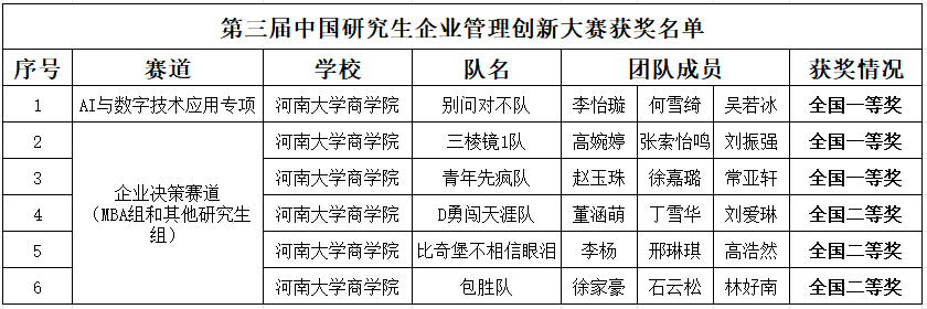 此次赛事的丰硕成果,既是对欧博abg官方网站研究生培养质量的检验,也充分彰显了学科竞赛育人体系的建设成效。未来,欧博abg官方网站将继续以“自信、拼搏、开放、创新”的新河大精神为指引,恪守“明德弘道,商善天下”的院训,持续深化研究生创新实践平台建设,着力培育具备系统专业能力与创新应用素养的高素质管理人才,为服务学科建设与高质量发展提供坚实人才支撑。
